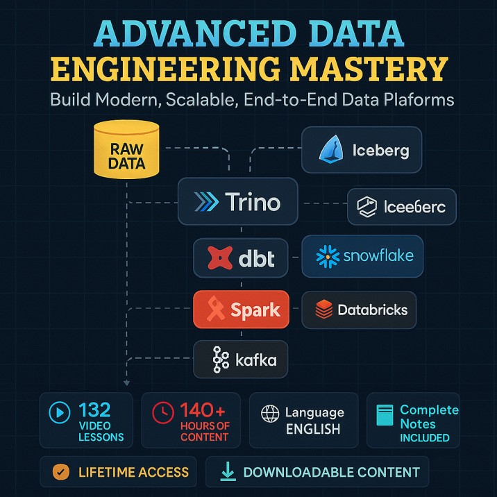 Whether you’re working with batch pipelines, real-time systems, or hybrid models, this course gives you the tools to confidently build enterprise-grade solutions using the most in-demand technologies like Apache Iceberg, Trino, Airflow, dbt, Spark, Snowflake, Kafka, and Databricks.